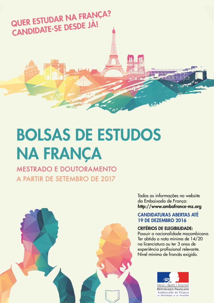 L’Ambassade de France lance une nouvelle campagne de bourses à destination des jeunes Mozambicains désirant effectuer un master ou un doctorat en France dans le cadre d’un projet d’étude et d’un projet professionnel solide. Ce programme vise à renforcer les mobilités entre nos deux pays et à compléter l’offre de formation des universités mozambicaines.