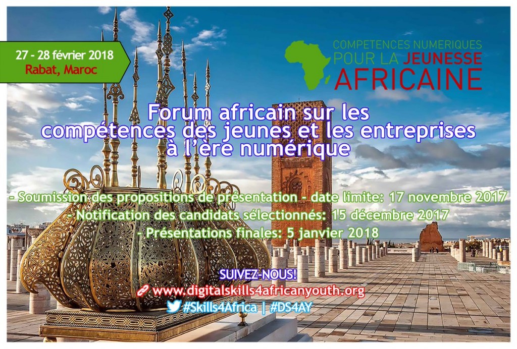 Forum africain sur les compétences des jeunes et les entreprises à l’ère numérique 27– 28 février 2018 31/10/2017 by admin Pour en savoir plus, cliquez ici