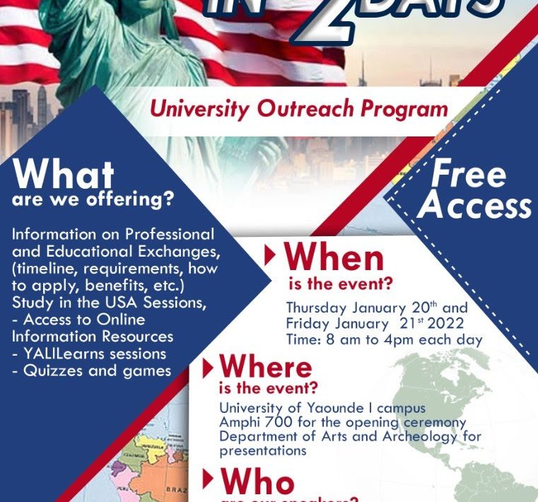 Souhaitez-vous en savoir plus sur les diverses opportunités, ressources et programmes financés par le gouvernement américain ? Nous vous donnons rendez-vous jeudi 20 et vendredi 21 janvier à l’Université de Yaoundé 1 pour une série de séances d’information.