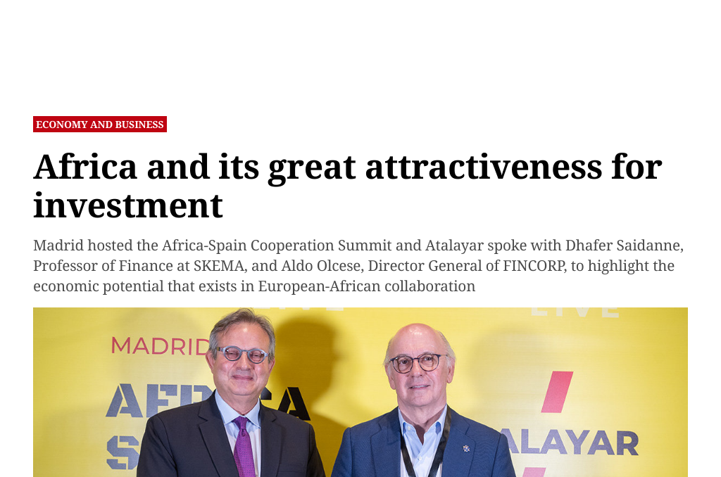 Selon un article publié par Atalayar et intitulé “L’Afrique et son grand attrait pour l’investissement – Atalayar”, Madrid a récemment accueilli le Sommet de la coopération Afrique-Espagne, qui visait à présenter le potentiel économique et financier de l’Afrique aux investisseurs et à souligner le rôle que l’Espagne et l’Europe peuvent jouer dans le développement du continent. L’article présente des entretiens avec Dhafer Saidanee, professeur de finance à la SKEMA Business School, et Aldo Olcese, directeur général de FINCORP, qui discutent des questions clés abordées lors du sommet.