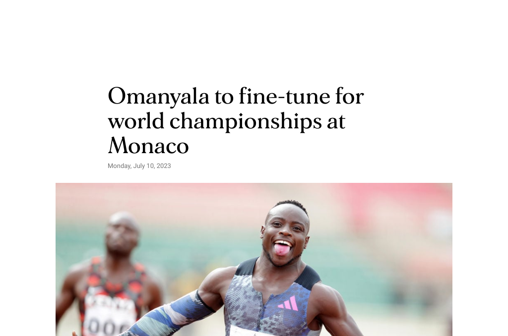 Dans un article publié par Nation et écrit par “J”, il est révélé que Ferdinand Omanyala, l’homme le plus rapide d’Afrique, peaufinera ses compétences lors du meeting de la Ligue de Diamant de Monaco avant de participer aux Championnats du Monde d’Athlétisme à Budapest. Omanyala, qui détient le record d’Afrique du 100 mètres, s’est dit confiant de pouvoir atteindre son objectif de courir la course en 9,6 secondes.