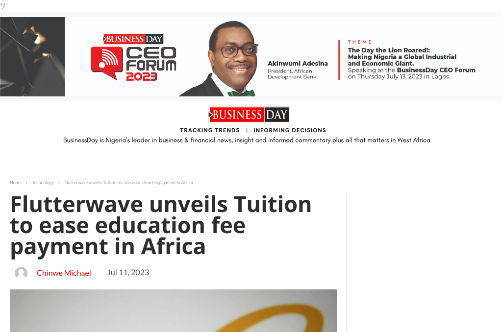 Dans un article publié par Businessday et rédigé par Chinwe Michael, intitulé “Flutterwave unveils Tuition to ease education fee payment in Africa – Businessday”, on apprend que Flutterwave, la société africaine spécialisée dans les technologies de paiement, a lancé un nouveau produit appelé Tuition. Ce produit permet aux utilisateurs de payer facilement divers frais auprès d’établissements d’enseignement en Afrique et à l’étranger en utilisant leur monnaie locale.