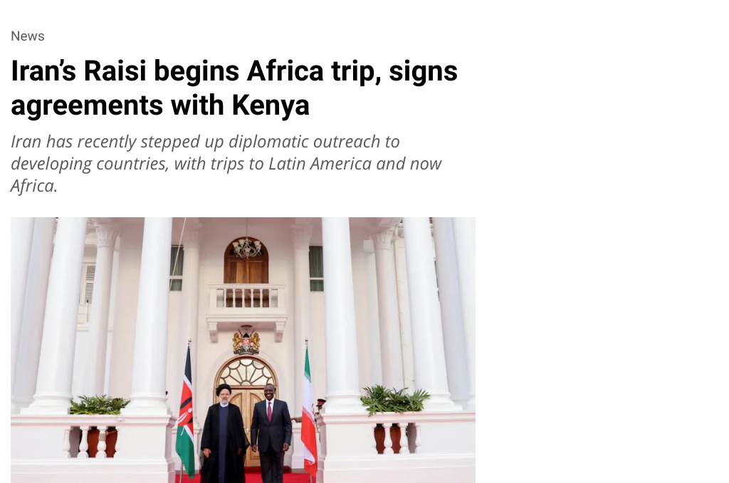 Le président iranien Ebrahim Raisi a entamé une tournée dans trois pays d’Afrique, en commençant par le Kenya, afin de renforcer les liens économiques avec le continent dans le contexte des sanctions américaines. Le voyage de M. Raisi, le premier d’un président iranien depuis plus de dix ans, vise à diversifier les relations économiques de l’Iran et à accroître les échanges avec les pays africains. Au cours de sa visite au Kenya, M. Raisi a signé cinq protocoles d’accord avec le gouvernement, dans des domaines tels que les technologies de l’information, la pêche, les produits de l’élevage et la promotion des investissements. M. Raisi a exprimé son désir de renforcer les liens commerciaux avec les pays africains, déclarant que le volume actuel des échanges commerciaux et économiques pouvait être amélioré. Le président kenyan William Ruto a demandé à M. Raisi de s’engager à faciliter l’exportation de thé, de viande et d’autres produits agricoles kenyans vers l’Iran et les pays d’Asie centrale. Cette visite intervient alors que le Kenya est confronté à l’augmentation de la dette et du coût de la vie, et que des manifestations se déroulent actuellement dans la capitale. L’Iran s’engage activement auprès des pays en développement depuis que les États-Unis se sont retirés du pacte nucléaire et ont imposé des sanctions en 2018. Les prochaines étapes de M. Raisi seront l’Ouganda et le Zimbabwe, afin de discuter du commerce et des relations bilatérales avec les dirigeants de ces pays. La dernière visite d’un dirigeant iranien en Afrique remonte à 2013 et avait été effectuée par Mahmoud Ahmadinejad.