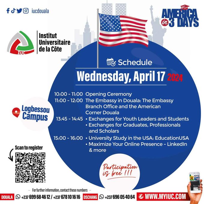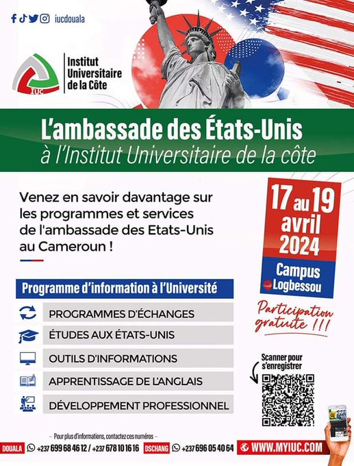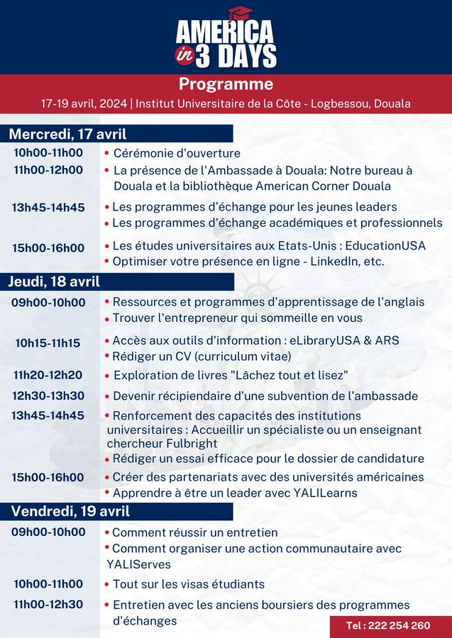 Etudes aux Etats-Unis: 17 au 19 avril durant l’événement “America in 3 Days” 13/04/2024 by admin Incrivez-vous pour l’événement « America in 3 Days » du 17 au 19 avril a Douala. incrivez-vous ici https://forms.office.com/g/EhcGRtFRPB
