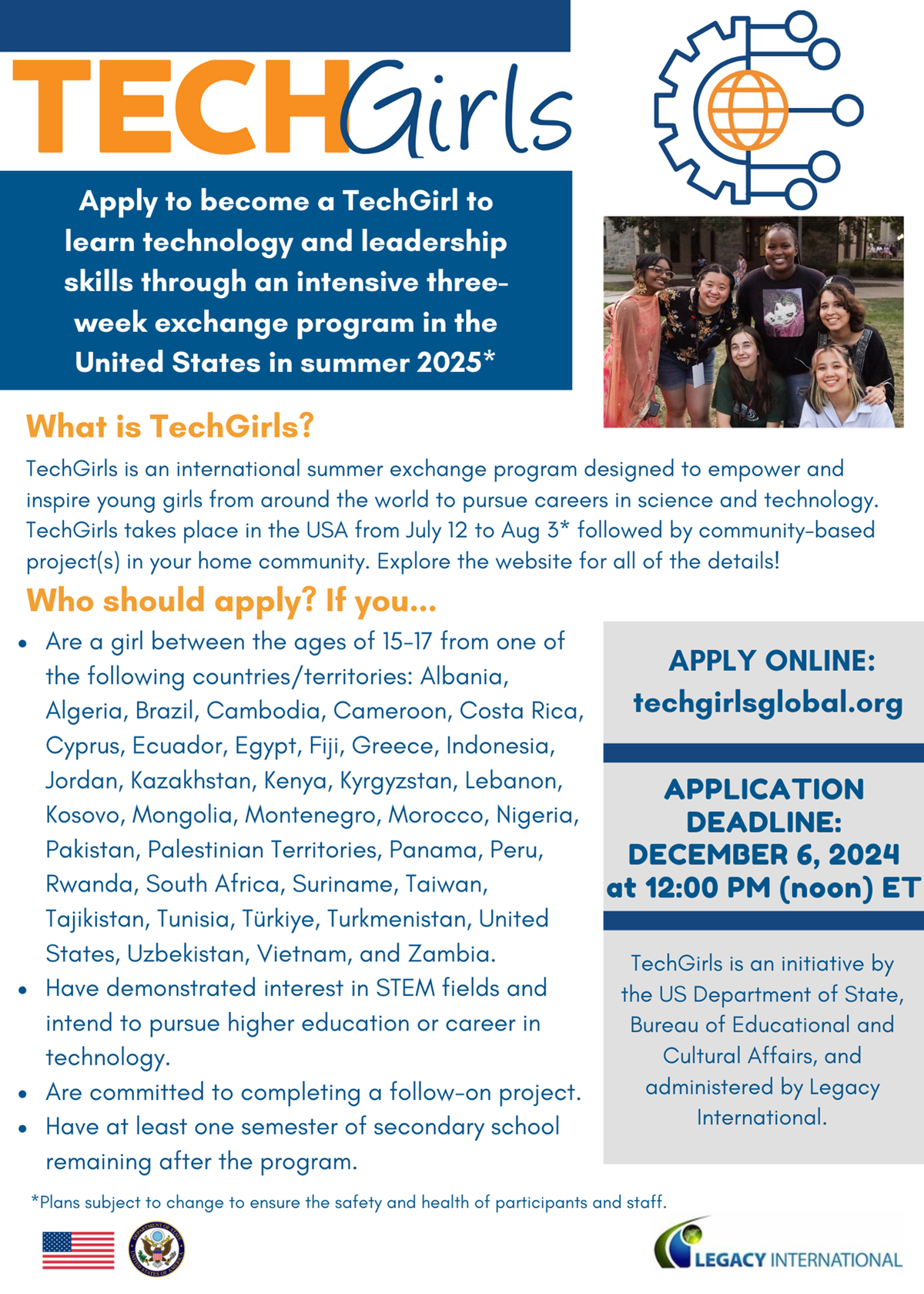 Connaissez-vous une jeune fille brillante et talentueuse, âgée de 15 à 17 ans, passionnée par les sciences, la technologie, l’ingénierie ou les mathématiques ? Si c’est le cas, elle pourrait devenir l’une de nos boursières TechGirls 2025.