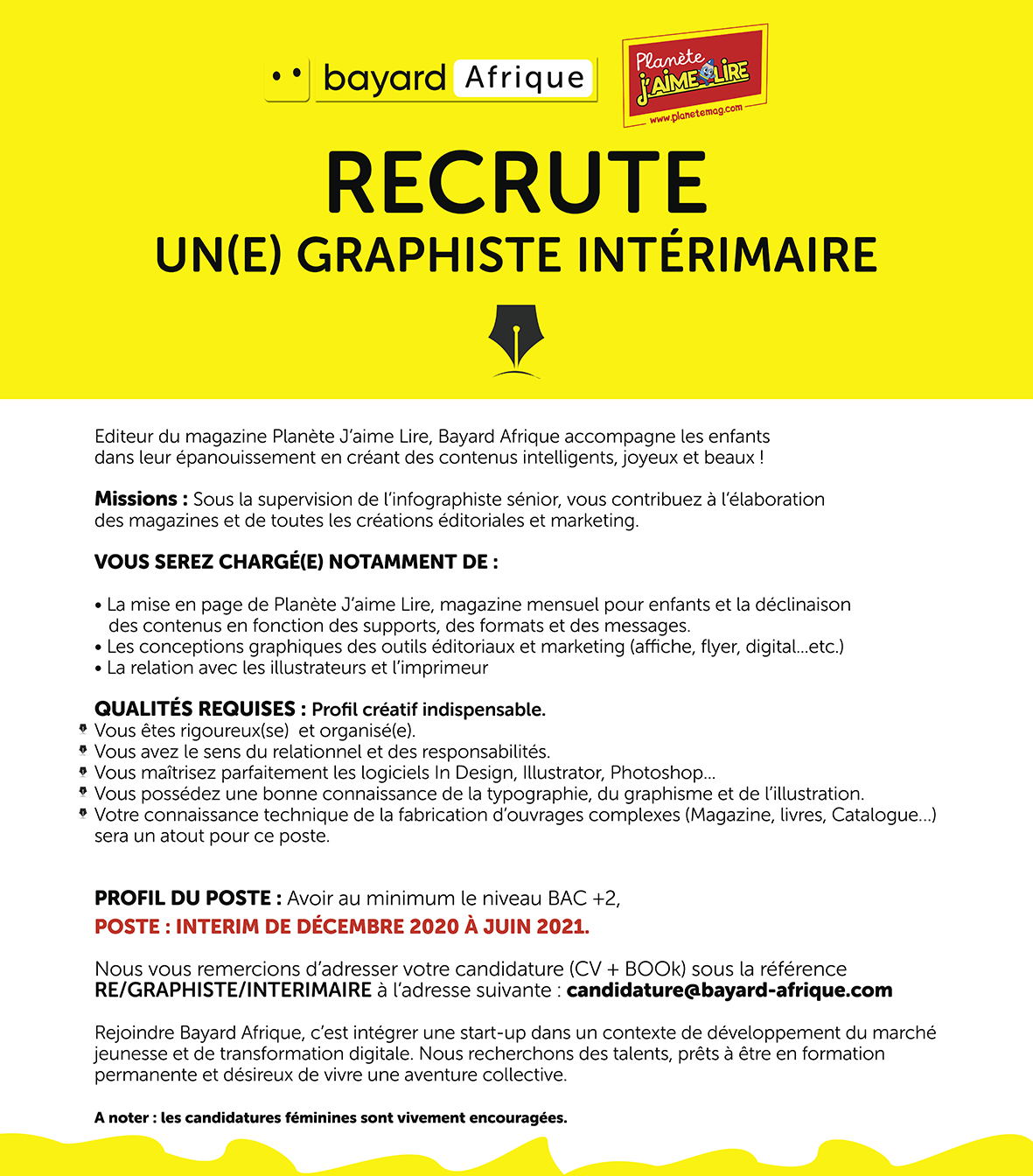 Si vous êtes #graphiste: superbe mission à Abidjan pour #PlaneteJaimeLire, 1er magazine pour enfants #MadeInAfricaPostulez ici : https://bit.ly/3iY2UT9